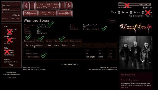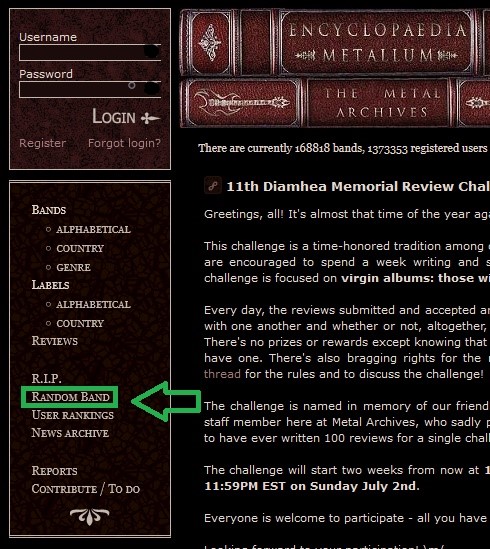 Players can navigate to objectives by clicking the tabs and internal links on a band’s Encyclopaedia Metallum page. Internal links are links that point to other pages on Encyclopaedia Metallum. Players can’t leave Encyclopaedia Metallum to complete objectives. Links on album, artist, band, country, and label pages are fair game. Internal links found under tabs are also fair game. However, links and functions found in the surrounding static frames are off-limits. Players can’t use the “Search” bar. They can’t use “Advanced Search.” They can’t use the “Bands” or “Labels” menu. They can’t access the “Forum.”