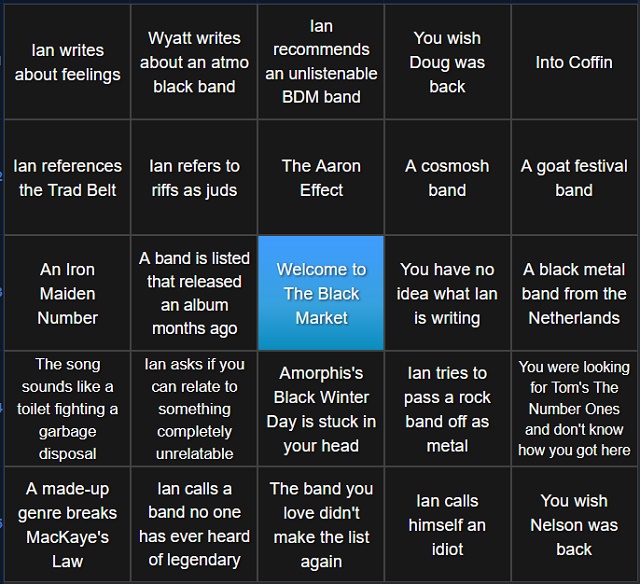 Tic Tac Dio uses the same basic set of rules. The object is to complete a line of five connected squares running vertically, horizontally, or diagonally as fast as possible. If a line can’t be achieved, players race to mark the majority of squares on the 25-square board. Players capture squares by completing the task stated within the square. Once a square is marked, it can’t be marked by other players. The twist is that, instead of the beautifully dangerous open world experience that is Elden Ring, Tic Tac Dio is set within the Amorphis-adoring confines of Encyclopaedia Metallum. Is it really that different? I mean, Ranni is probably into Mortiis, right?