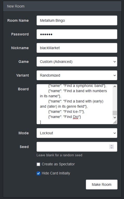 Making the Board: Like Bingo Brawlers, you can use Bingosync.com to create a randomized board. After filling in a “Room Name,” “Password,” and “Nickname” in the “New Room” fields on the right of the screen, change the “Game” in the drop-down to “Custom (Advanced).” Change the “Variant” drop-down to “Randomized.” The “Board” textbox requires “a JSON list of goals.” Luckily for you, I’ve uploaded a sample JSON file here. (This file contains over 100 possible squares and is fully customizable. The formatting is self-explanatory. If you encounter issues opening the file, there’s a text version here.) Cut and paste the complete contents of that file into the textbox. Change “Mode” to “Lockout.” Leave “Seed” blank. Check “Hide Card Initially.” Your fields should look like this: