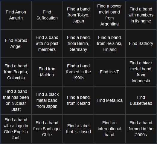 A player must travel to the band, label, etc. page to complete an objective and mark a square. For example, if the objective is to “Find Suffocation,” the player must reach a Suffocation band page. (There are multiple Suffocations, therefore any Suffocation band page meets this objective.) Simply seeing Suffocation’s name under a “Similar Artist” tab or as part of a label’s roster is insufficient. (That is to say, it would be impossible for a player to find Body Count because it does not have a page in Encyclopaedia Metallum. However, a player can find Ice-T, the metal singer of the metal band Body Count, because Ice-T has an artist page.)
