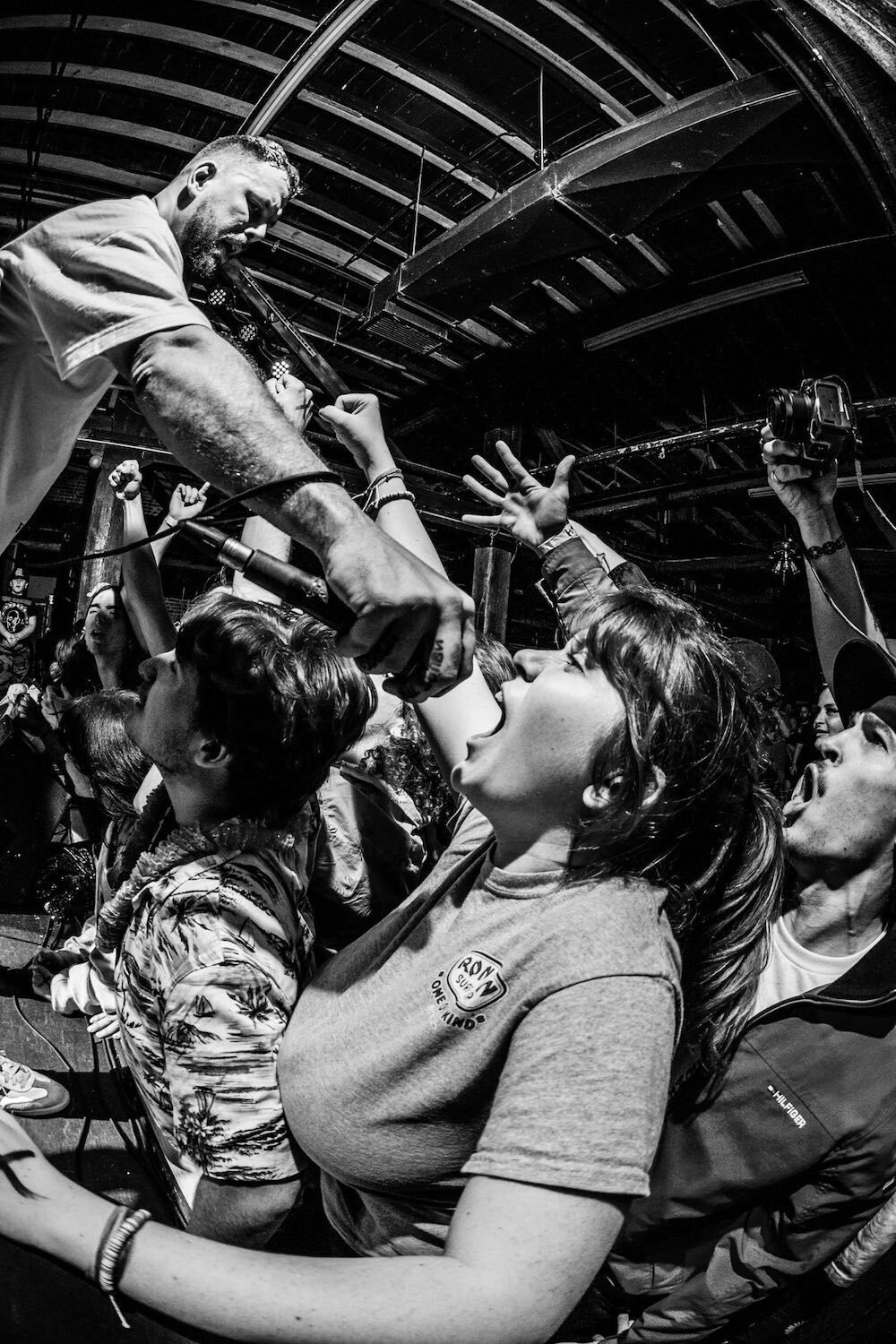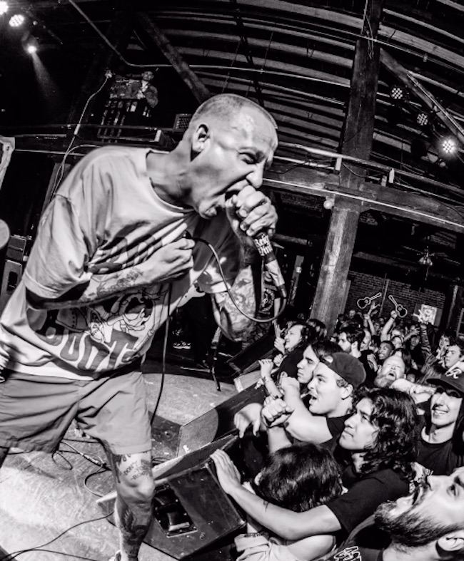 Onstage, Ciaramitaro is a total energy ball. He runs back and forth, he bounces, and he barks out constant instructions. He’s not just demanding circle pits or side-to-side action. He’s telling everyone in the room to lock arms and run over to the bar so that the people on that side of the room don’t get left out. He’s getting everyone to squat down and jump up at the same time. He’s yelling: “Hands up! Hands up! 8 Mile! 8 Mile!” He’s speaking to people who might be at their first hardcore show, telling them all about how much fun the culture is and how all these very different bands fit together. He’s looking for people who know the words to the songs and then hucking the mic into the crowd underhand, like he’s shooting a free throw in 1955.